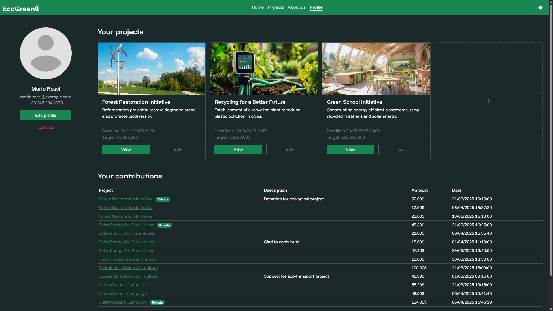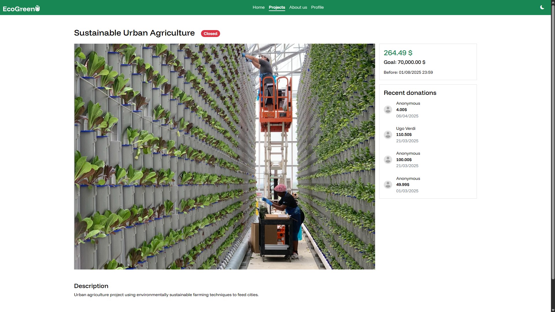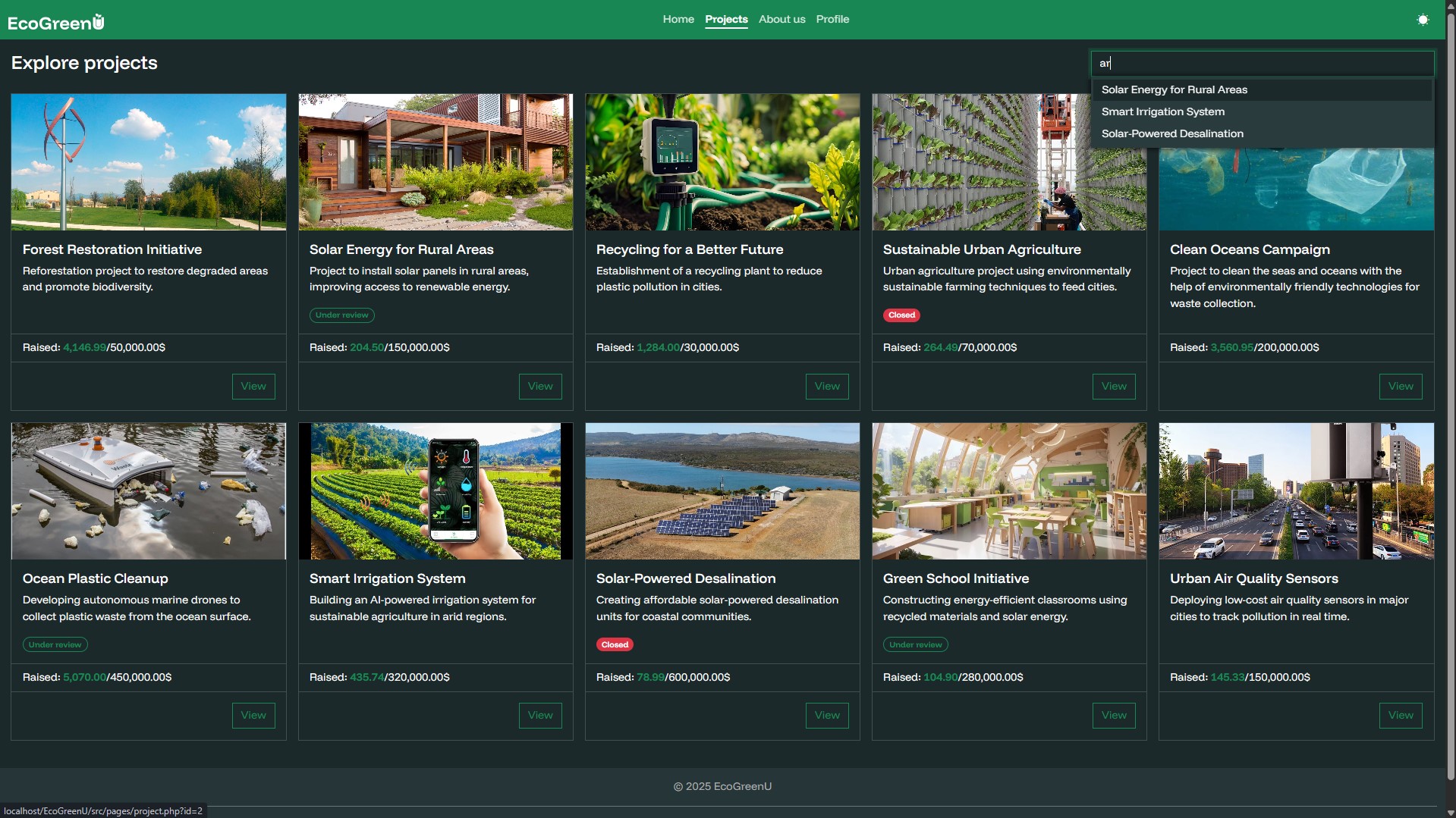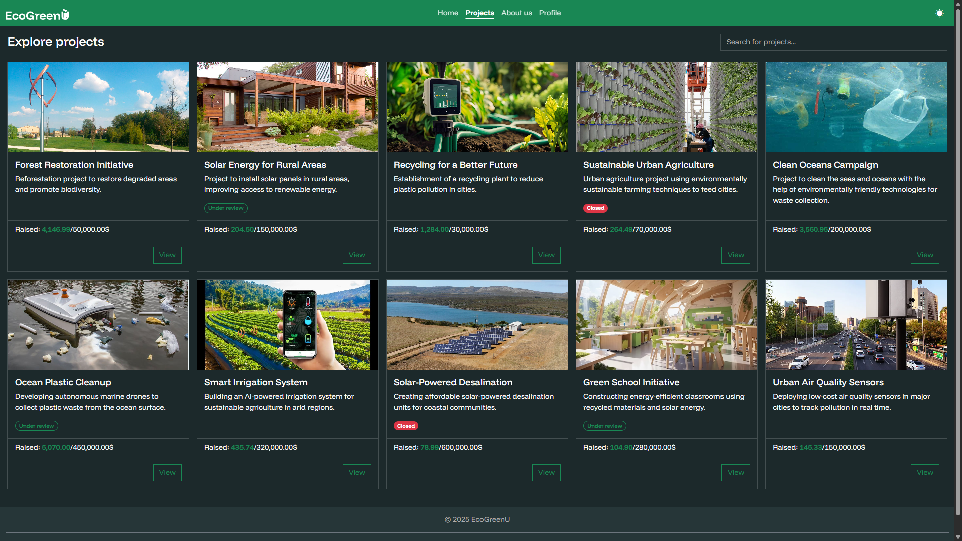 EcoGreenU is a fictional crowdfunding platform (inspired by GoFundMe) that allows users to create an account, create and manage projects, and donate funds to other ecological initiatives. EcoGreenU is the result of a school assignment given to learn how to manage database connections and query data from our web-based applications.