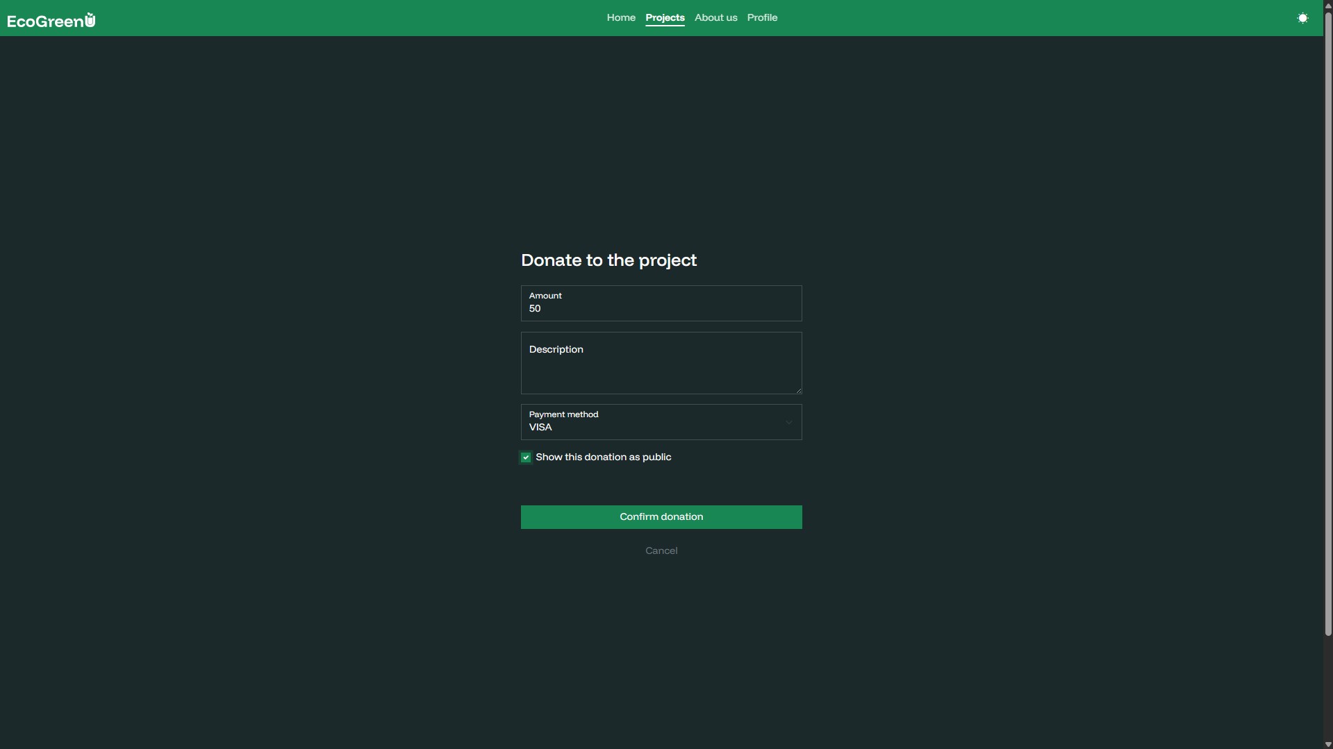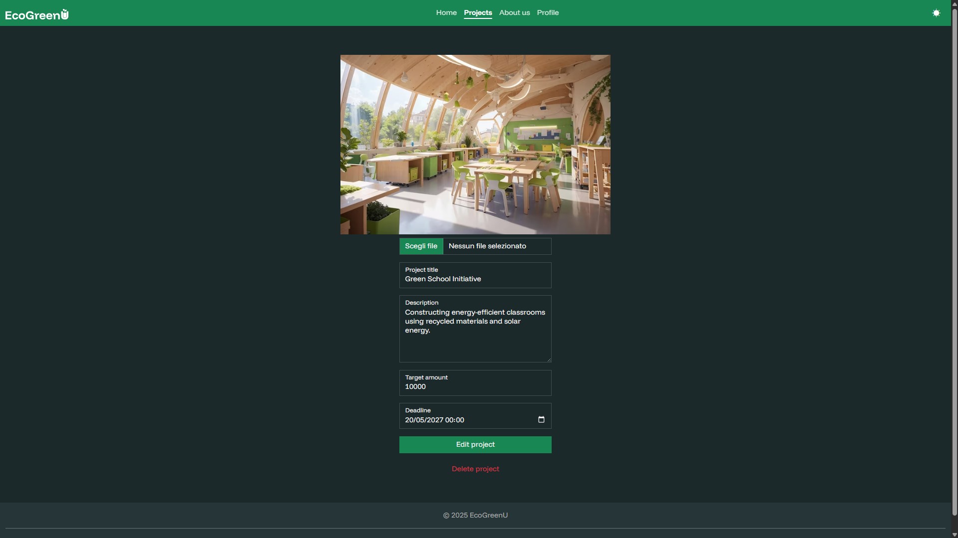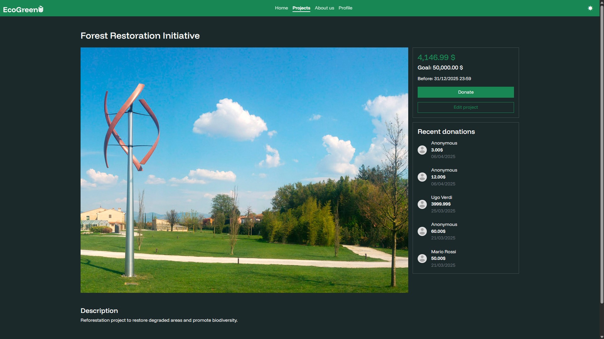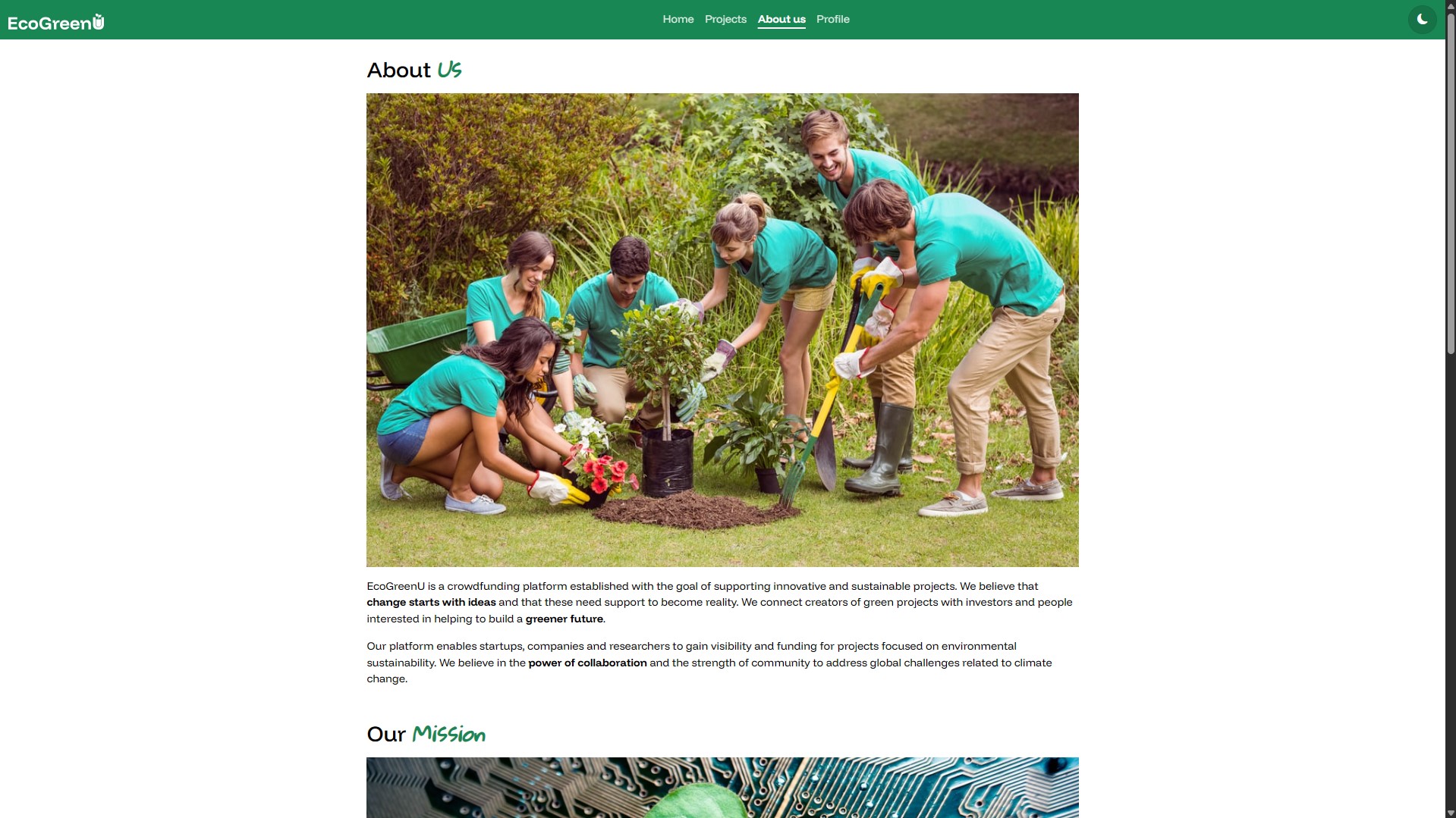 EcoGreenU is a fictional crowdfunding platform (inspired by GoFundMe) that allows users to create an account, create and manage projects, and donate funds to other ecological initiatives. EcoGreenU is the result of a school assignment given to learn how to manage database connections and query data from our web-based applications.